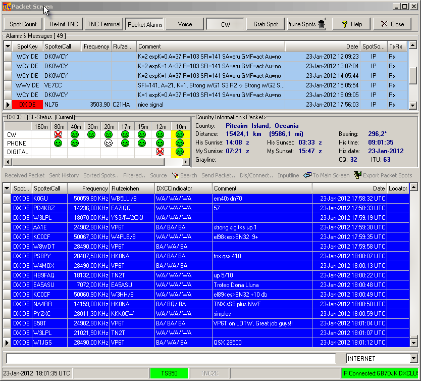 Zusätzlich findet sich allerdings auch noch die DXCC-Matrix mit Informationen zum letzten Spot, sowie die dazugehörige Landes-Information. Die Eingabezeile am unteren Bildschirmrand ist standardmäßig geöffnet.